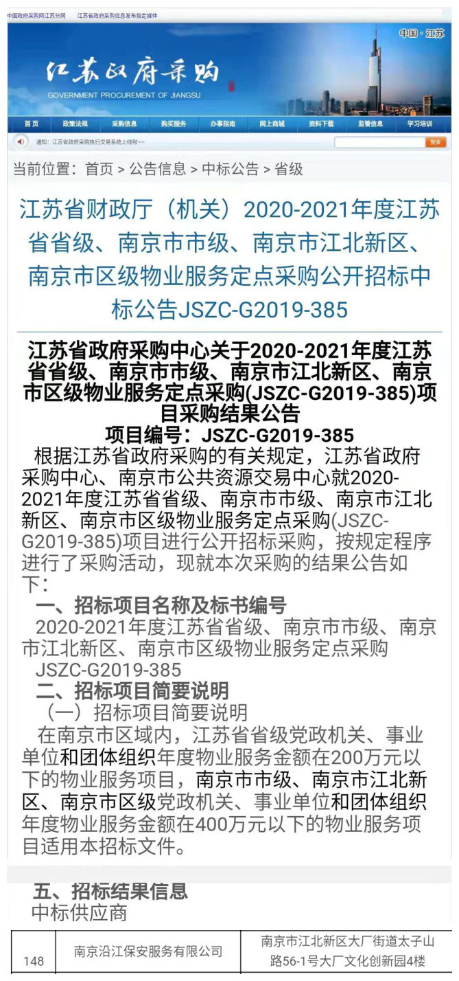“南京沿江保安服務(wù)有限公司”憑借多年的積累和全體員工的辛苦付出、不懈努力,在本次招標(biāo)活動中正式成為2020-2021年度江蘇省省級、南京市市級、南京市江北新區(qū)、南京市區(qū)級物業(yè)服務(wù)定點采購指定單位。