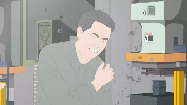 車間內(nèi)一片忙碌的景象,工人們都在有條不紊地干活。馮剛在準備獨自拾起一件重物的過程中,突然感到肩膀疼痛,使不上勁兒。重物掉落在地上。