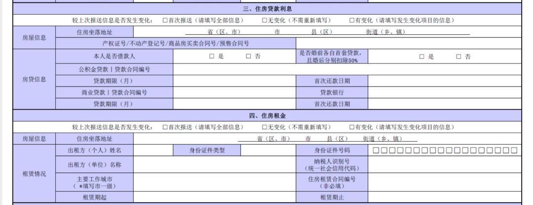 住房貸款利息:住房坐落地址、不動產(chǎn)登記號、本人是否為借款人、是否婚前各自首套貸款、貸款合同編號、貸款期限、首次還款日期、貸款銀行等