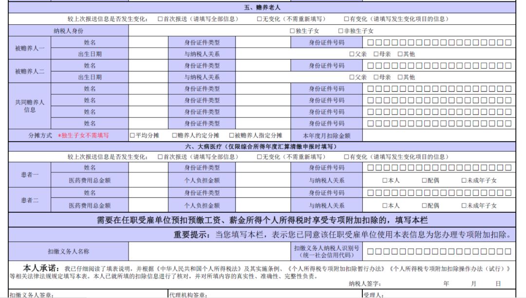 贍養(yǎng)老人:勾選獨生子女/非獨生子女、被贍養(yǎng)人姓名及身份證號、共同贍養(yǎng)人、分攤方式、本年度月扣除金額等